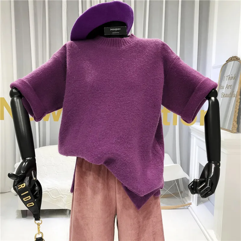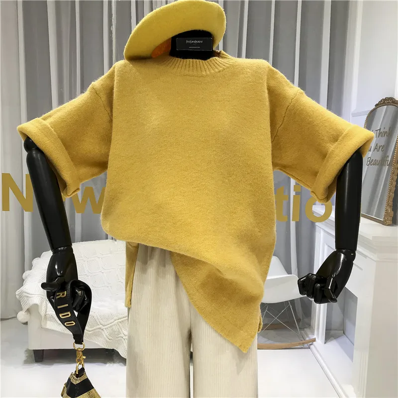 Short Sleeve Women Sweater and Pullovers 2020 Autumn Winter O-Neck Casual Loose Yellow Warm Womens Sweaters |