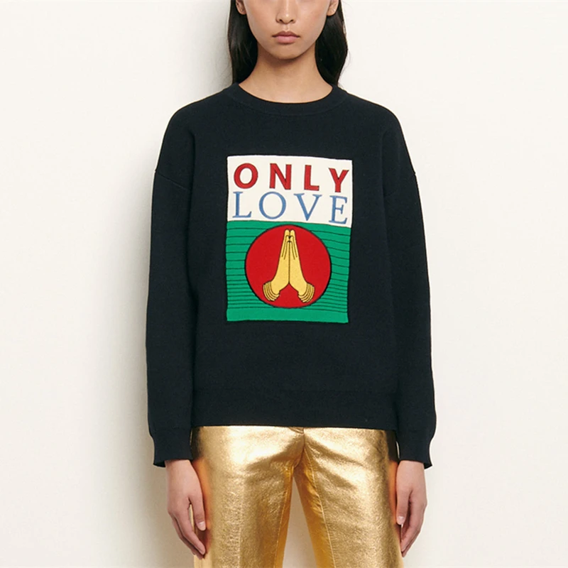 Women Sweater Loose Letter Jacquard Striped Knitted Embroidery Pullovers Long Sleeve Top Autumn Winter Jumper Plus Size |