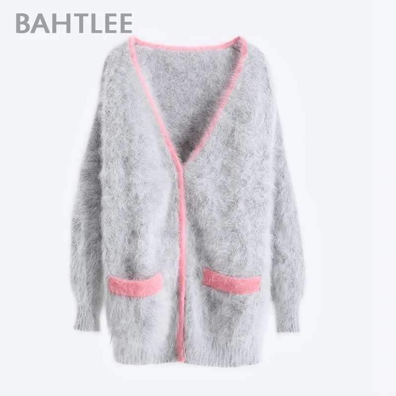 | BAHTLEE Winter Women Knitted Cardigans Sweater With Pocket Wool Angora Coat Jumper Long Sleeves V-Neck Patchwork |