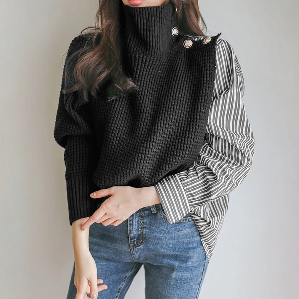 QUEVOON Fashion Womens Turtleneck Sweaters Patchwork Long Sleeve Knitted Oversized Pullovers Casual Ladies Jerseys Streetwear