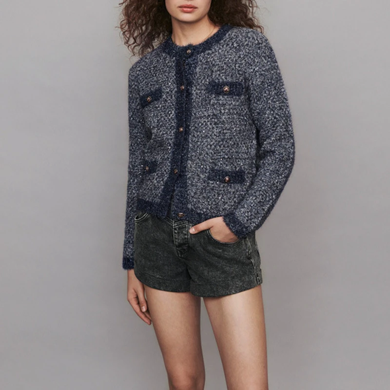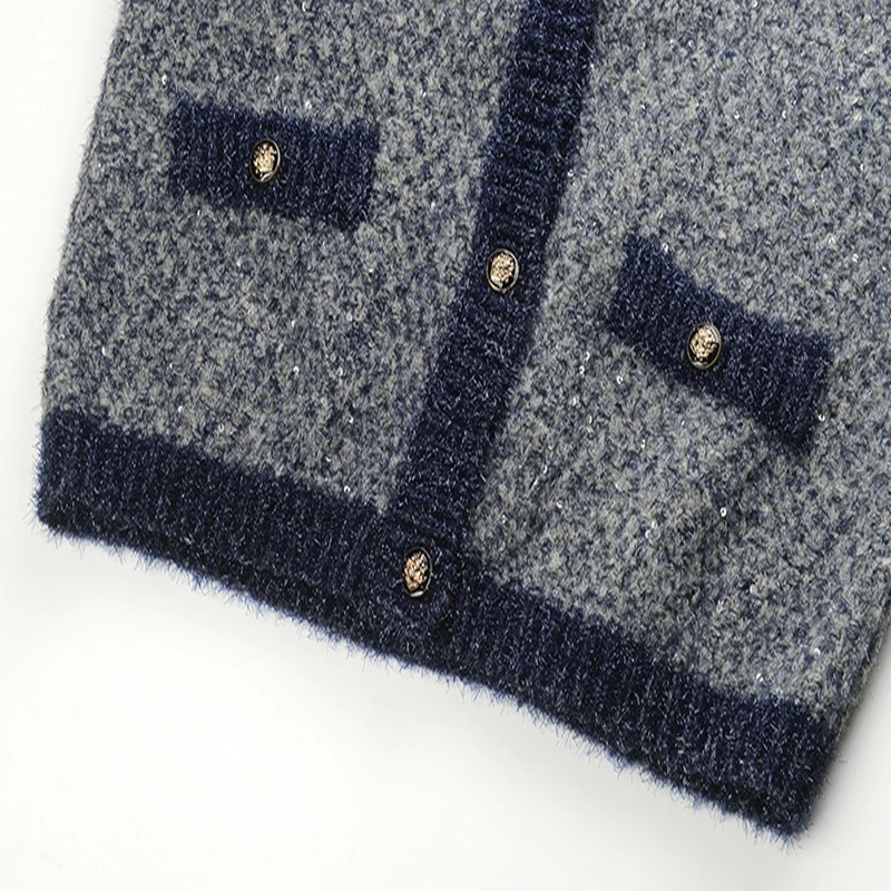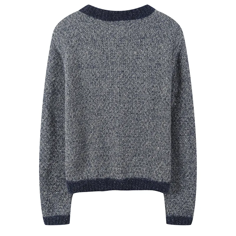 Women Cardigan Lurex Slim Fit Sequin Beading Knitted Color Block Sweater Coat Long Sleeve Top Button Knitwear Autumn Winter
