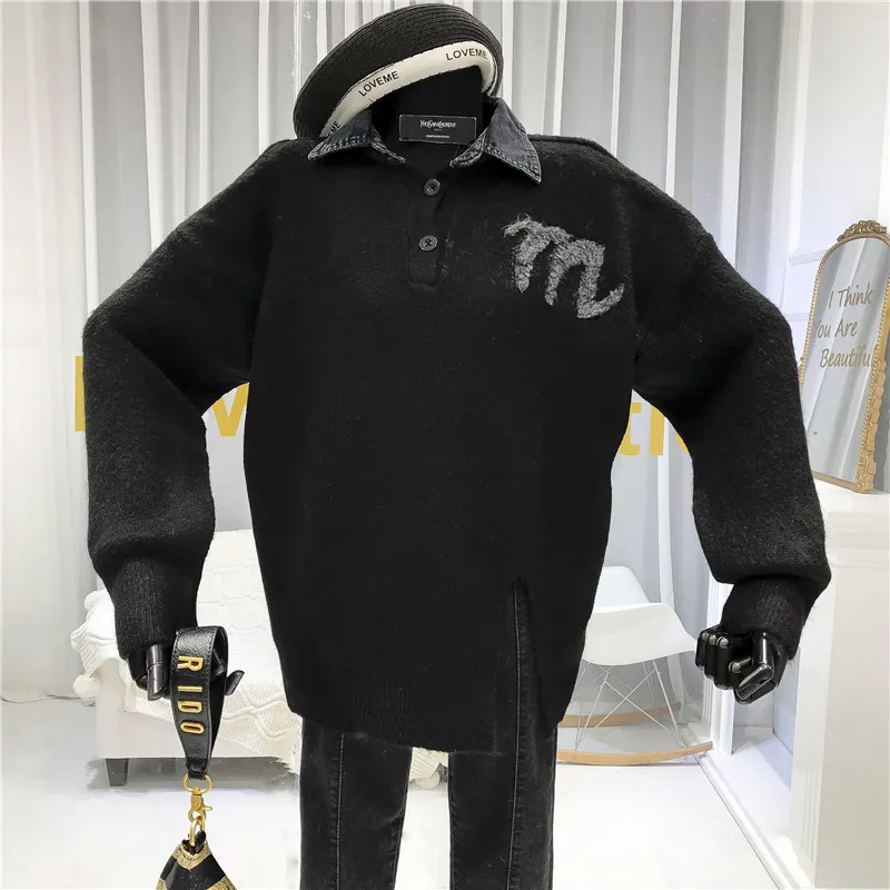 Designer Patchwork Denim Womens New Sweaters Jersey De Mujer Invierno Fashion Pullover Preppy Style Turn-down Collar Letter