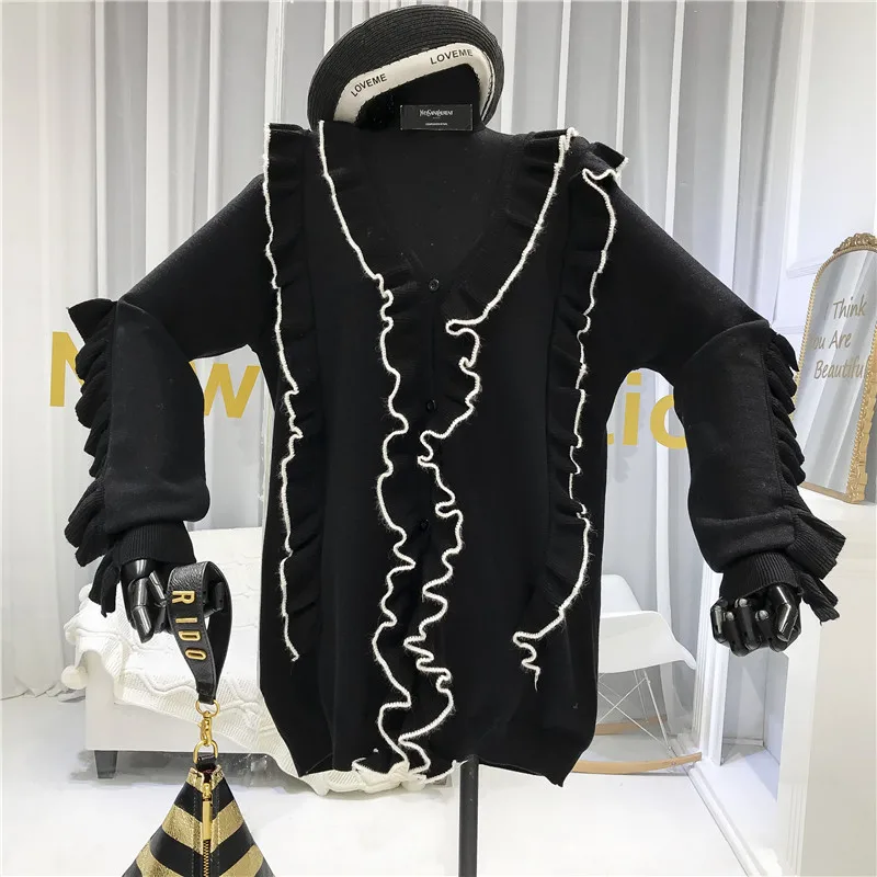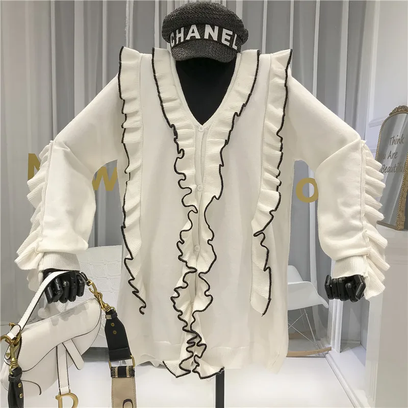 | Ruffles V-Neck Long Womens Sweater Ladies Winter Knitted 2019 New Solid Japan Style Jersey De Mujer Invierno Pullovers |